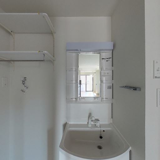 独立洗面台と収納付き(確度86%):鏡収納のある独立洗面台が設置され、横に可動棚の収納が見える。
