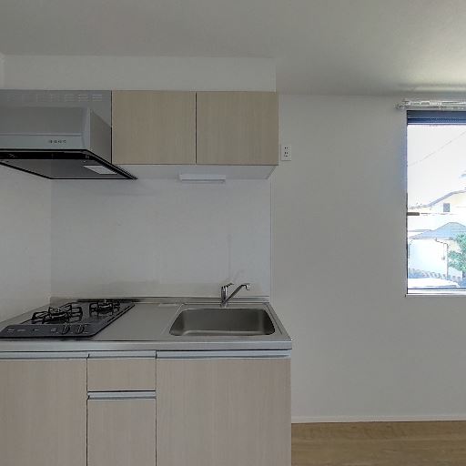 キッチンの新しさ・清潔感(確度80%):2口ガスコンロとシンクが一体のコンパクトキッチン。レンジフードや吊戸棚も整っており、全体的に新しく清潔に見える。
