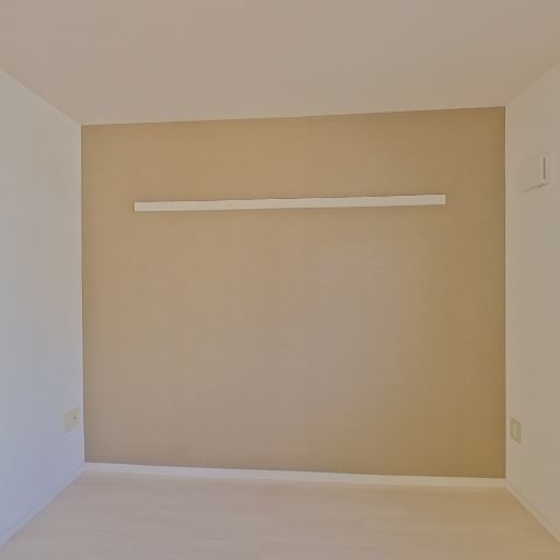 • アクセントクロスとピクチャーレール(確度90%):一面だけベージュ系のアクセントクロスで、上部に長いピクチャーレールが取り付けられている。