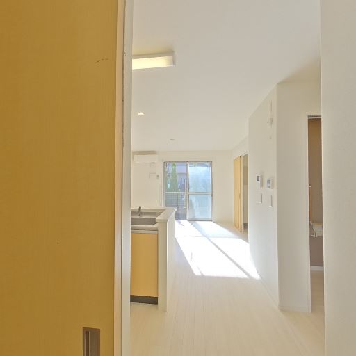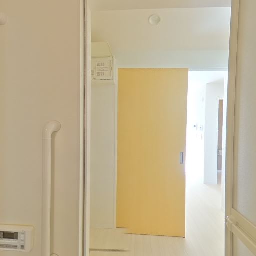 • 設備スイッチとサニタリー動線(確度70%):壁にインターホンやリモコンが並び、その先に洗面・トイレらしきスペースへの開口がある。