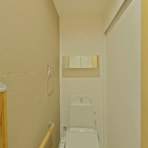 • 収納と小物掛け(確度83%):便器前方の壁に吊戸棚タイプの収納、側面にタオルリングがある。