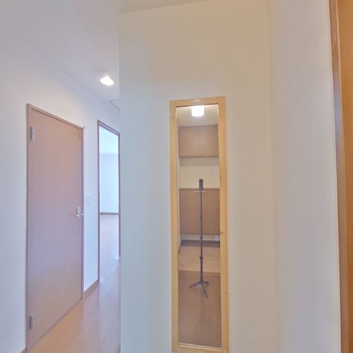 • 姿見ミラーあり(確度86%):廊下の壁に全身が映る縦長ミラーが設置されている。