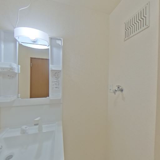 • 独立洗面台と収納付き(確度86%):鏡付きの独立洗面台があり、横に小物用の収納棚が見える。