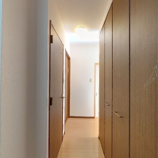 • 廊下の採光は間接的(確度69%):天井照明が点灯しており、奥の居室側からの自然光が少し入っているが、玄関自体は採光が弱い。