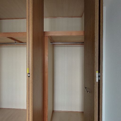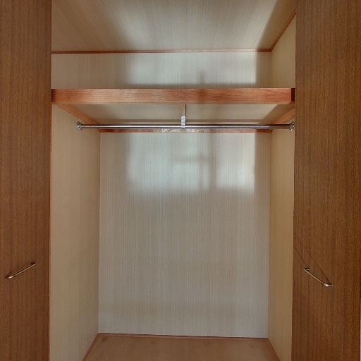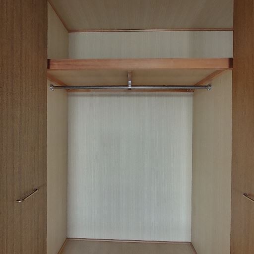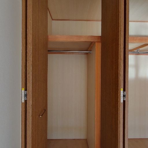 • クローゼット収納(確度86%):ハンガーパイプと上部棚がある開き戸タイプのクローゼット。幅はそこそこあり、コートやトップスの吊り収納が可能。