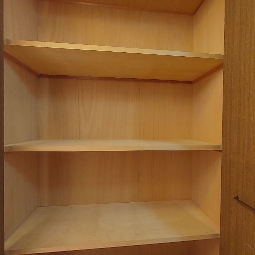 • 収納棚付きの小型クローゼット(確度85%):木製の可動棚が複数あり、日用品やストックを整理しやすい造りに見える。