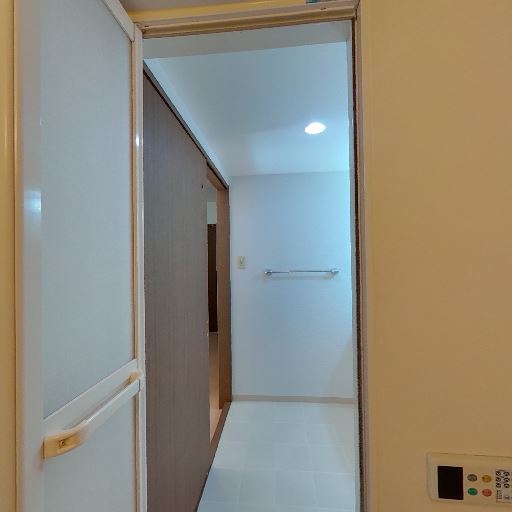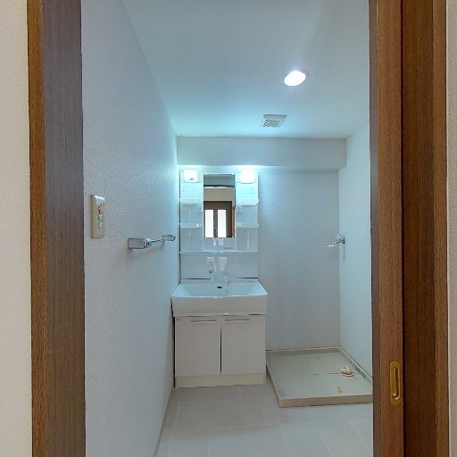 • 洗面脱衣所が近接(確度86%):開いた扉の先に洗面台と洗濯機置場が見える。