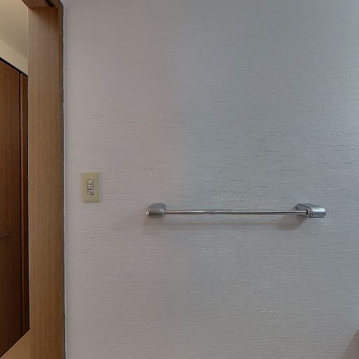 • タオル掛けとコンセント位置(確度76%):壁に横長のタオルバー、スイッチ・コンセントが適切な高さに配置。