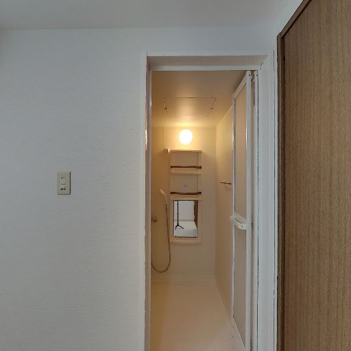 • 浴室が隣接(確度86%):開口部の先に浴室が見え、シャワーや鏡、棚が確認できる。