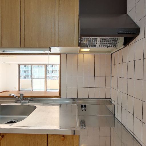 • キッチン設備の充実度(確度86%):シンク・コンロ用の作業台、上部吊戸棚、レンジフードが揃った壁付けキッチン。タイル張りで清掃しやすい。