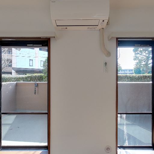 • エアコン設置済み(確度95%):窓の間の壁にエアコン本体と配管が見える。