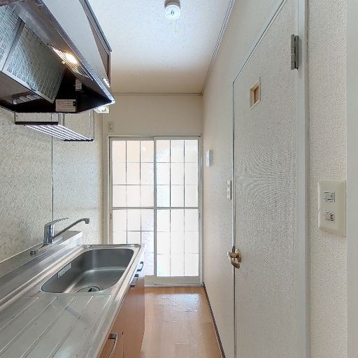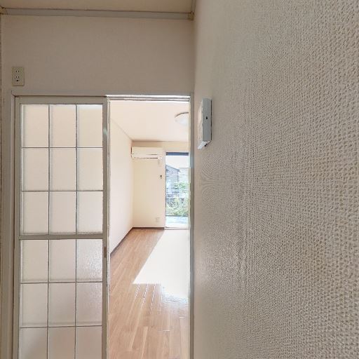 キッチンへの動線(確度77%):引き戸の先にキッチンが続くワンルーム構成。