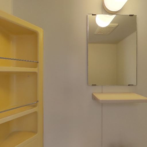 経年感のある内装色と素材(確度73%):樹脂パネルやアイボリー系の設備で全体にやや古めの雰囲気。目立つ破損は見当たらないが新築感はない。