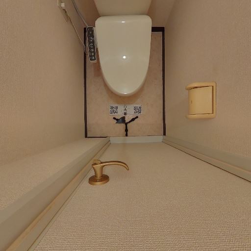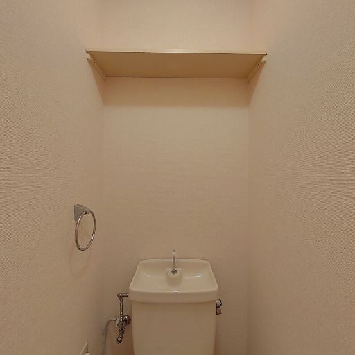 収納棚あり(確度86%):便器正面の上部に一段の棚が固定されている。トイレットペーパー等の置き場に使えそう。