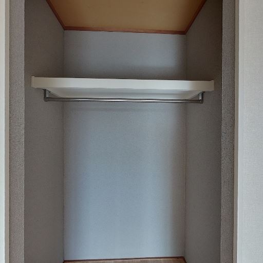 クローゼットあり(確度84%):ハンガーパイプと上部棚のある収納スペースが確認できる。奥行きは標準的で上部は三角形状の天井。