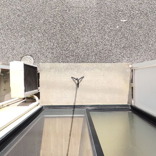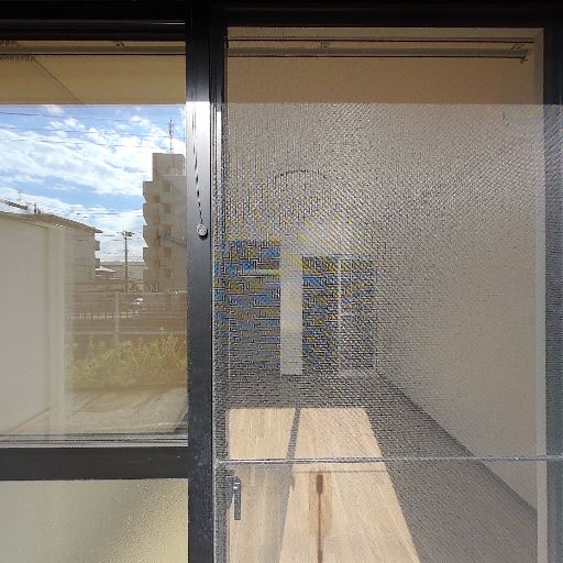 採光ポテンシャル(確度80%):大きめの掃き出し窓と曇りガラス越しでも強い日差しが入っている。室内床まで日が差し込む。