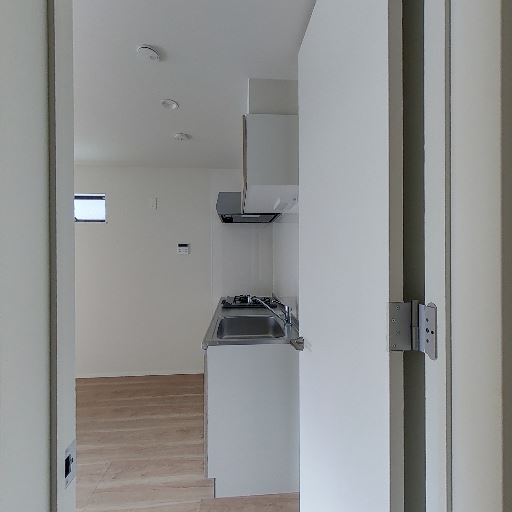 玄関からキッチンまでの一直線動線(確度84%):玄関側の廊下からスライドドアを抜けるとすぐキッチン・居室スペースに繋がっている。調理スペースが廊下に近く、買い物後の搬入がスムーズそう。