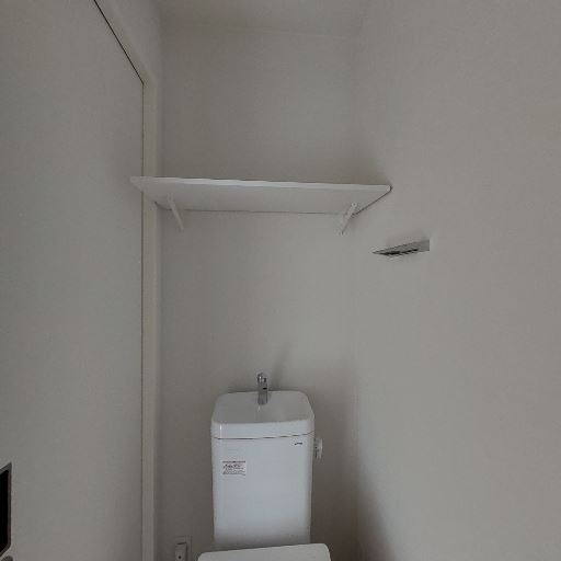 トイレに収納棚あり(確度86%):便器上部にシンプルな壁付け棚が1段設置されている。トイレットペーパーや掃除用品の置き場として使えそう。