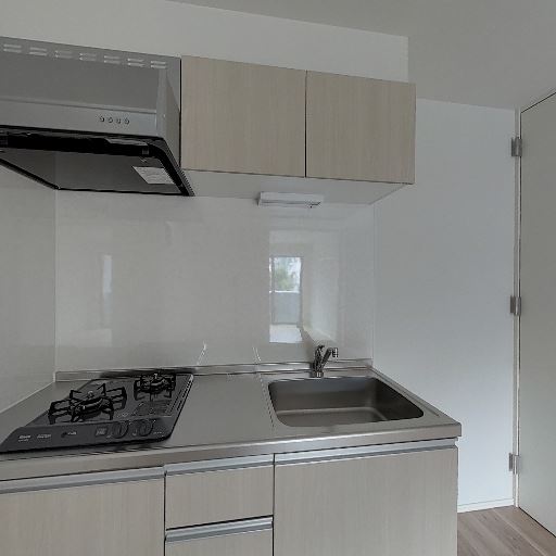 コンパクトなシステムキッチン(確度90%):2口ガスコンロとシンクが一体のミニキッチンで、上部に吊戸棚・レンジフードあり。調理スペースはやや狭め。