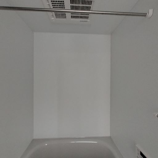 浴室乾燥・換気設備あり(確度86%):天井に換気扇と操作パネルらしきものがあり、物干しバーも設置されている。浴室乾燥機能がある可能性が高い。