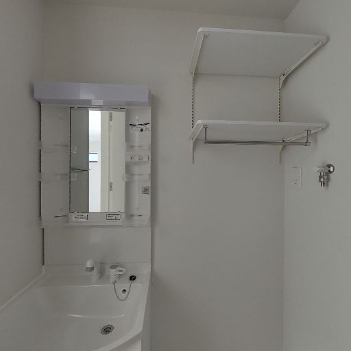 独立洗面台と収納棚(確度86%):鏡付きの独立洗面台と、壁付けの可動棚が2段設置されている。日用品を整理できそう。