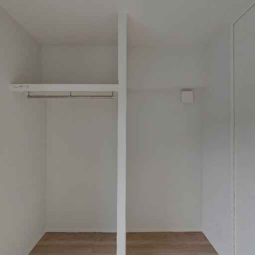 クローゼットのハンガーパイプ付き収納(確度87%):壁面に奥行きのあるクローゼットがあり、棚板とハンガーパイプが設置されている。