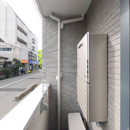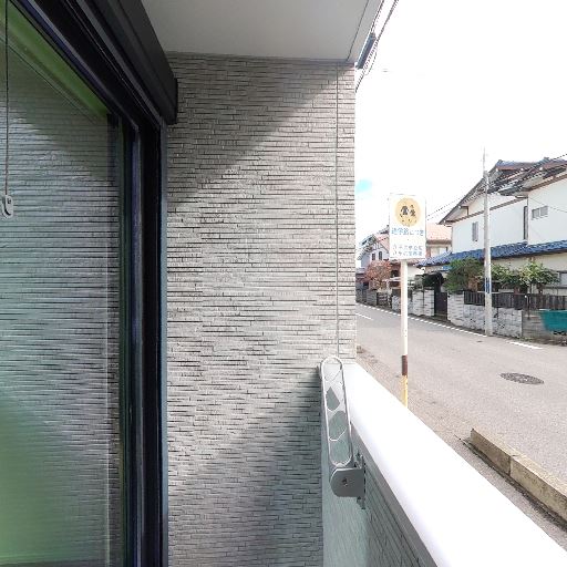 バルコニーの奥行きと物干し金具(確度86%):手すり内側に物干し金具があり、細長いバルコニーが確認できる。
