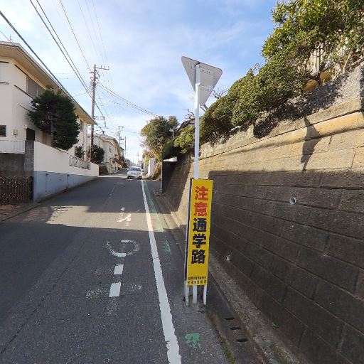 前面道路は坂道で車通りあり(確度76%):家の前は勾配のある舗装道路で、センターの色分けや矢印表示があり一定の交通量が想定される。