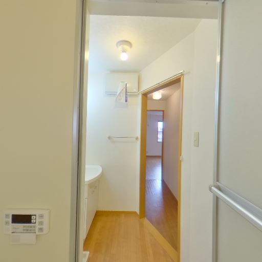 浴室・脱衣所が隣接し動線良好(確度78%):浴室ドアの先に洗面台と脱衣スペース、さらに居室が一直線に見える。