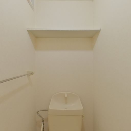 トイレ上部の収納棚(確度86%):便器上に奥行きのある一枚棚があり、トイレットペーパーや洗剤の収納に使えそう。