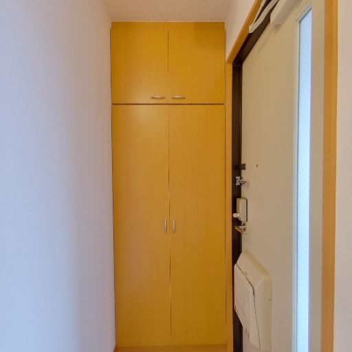 玄関収納の充実(確度90%):玄関脇に天井近くまである縦長の収納が設置されている。靴や日用品の収納力が高そう。