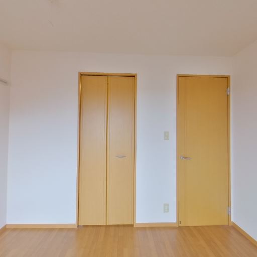 収納スペースあり(確度72%):片開き戸と折れ戸の2種類の扉が並んでおり、クローゼットや物入れが確保されていると推測。