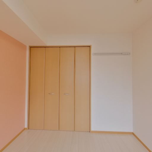 • アクセントクロスと壁面収納(カウンター)(確度73%):一面が淡いオレンジのアクセントクロス。壁に薄型の棚orカウンターが取り付けられている。