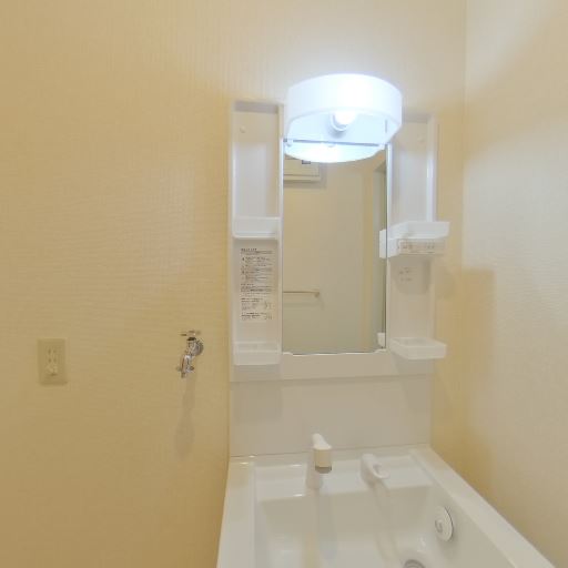 • 独立洗面台と収納付きミラー(確度86%):明るい照明のついた独立洗面台で、ミラー横に小物棚とコンセントがあり身支度しやすそう。