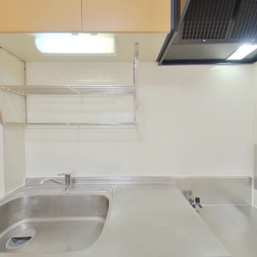 • キッチンの状態(確度82%):シンク・天板・吊戸棚・レンジフードがきれいで、金属ラックの収納もある。全体的に清潔感がある。