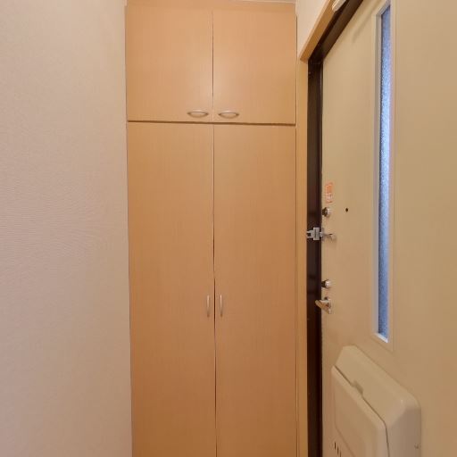 • 玄関収納の充実(確度86%):背の高いシューズボックスが設置されており、上下に分かれた大容量の収納が見える。