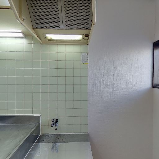 キッチンは単身向けサイズ(確度86%):流し台と吊戸棚があり作業スペースはコンパクト。壁はタイル張りで掃除しやすそう。