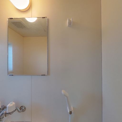 鏡と照明が壁付け(確度83%):洗面横に四角い鏡と球状の照明が取り付けられている。