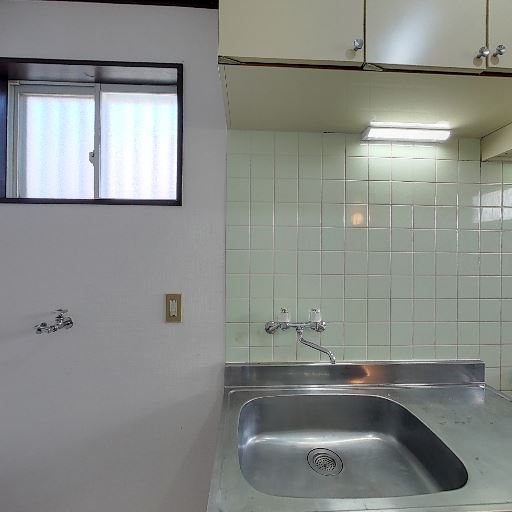 キッチンシンクとタイル壁(確度82%):ステンレスシンクが比較的きれいで、壁は淡いグリーン系タイル。手元灯も設置されている。