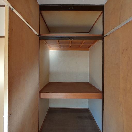 押入れタイプの収納(確度86%):木製の上下二段の収納スペースがあり、布団や大型荷物を仕舞える造りに見える。