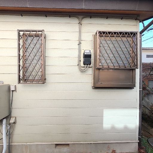 窓に面格子と網戸あり(確度78%):外壁の窓は面格子付きで、防犯性と転落防止に配慮されている。片方の窓には網戸が見える。