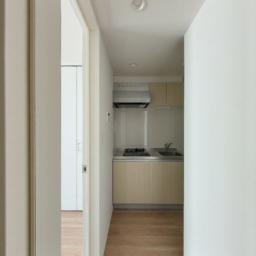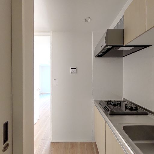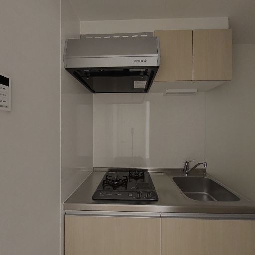 • コンパクトなシステムキッチン(確度88%):2口ガスコンロ、レンジフード、上部吊戸・シンク付きで単身向けサイズにまとまっている。