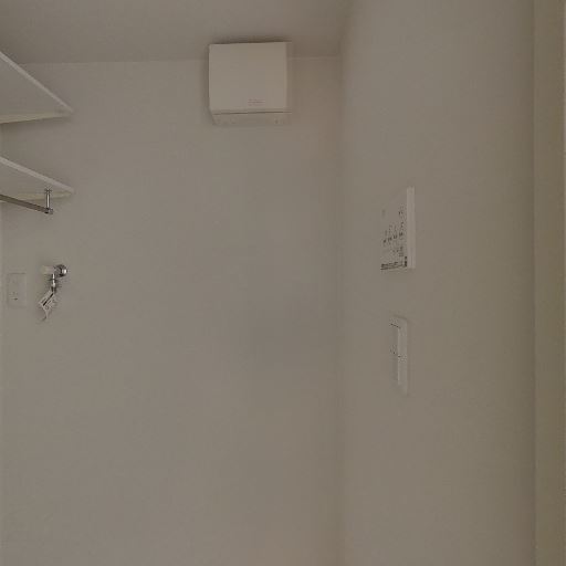 • 洗濯機置き場あり(確度93%):防水パンと水栓、排水口が確認できる。上部に棚とハンガーパイプもある。