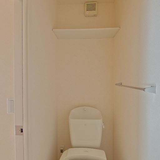 • 収納棚とタオル掛けの備え付け(確度82%):便座上部に奥行きのある棚、側面にタオルバーとトイレットペーパーホルダーがある。