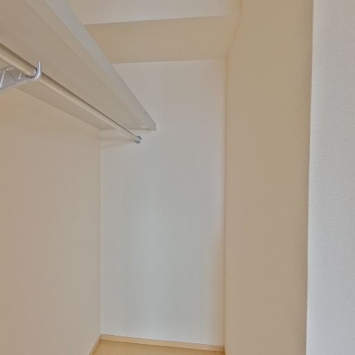 • ウォークインクローゼットの存在(確度90%):ハンガーパイプと奥行きのある空間があり、衣類を掛けて収納できるクローゼットと分かる。
