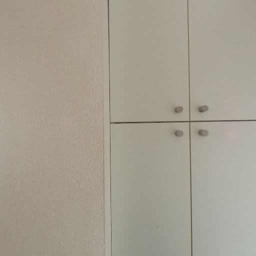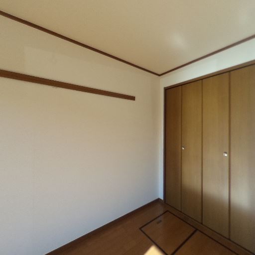 • 収納の充実(確度82%):壁一面に観音開きのクローゼット扉があり、床下収納フタも見える。