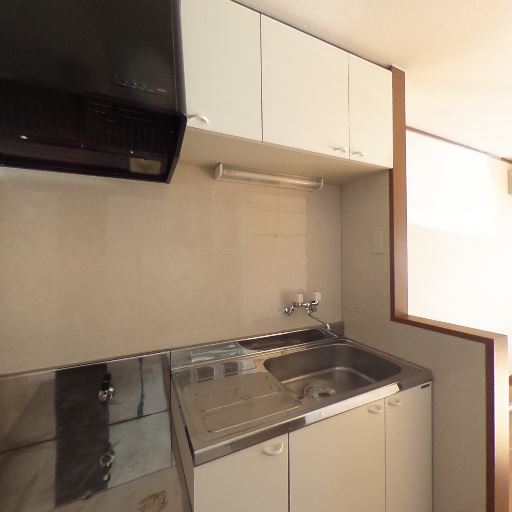 • キッチンの基本設備(確度86%):シンク・ガス台スペース・上部/下部収納・レンジフードが確認できる。調理台面はやや狭め。