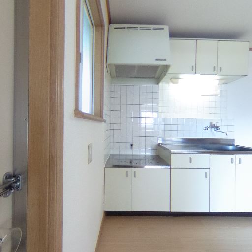 キッチンに窓があり明るい(確度92%):キッチン脇に縦長の窓があり、調理スペースに自然光が入りやすい構成に見える。