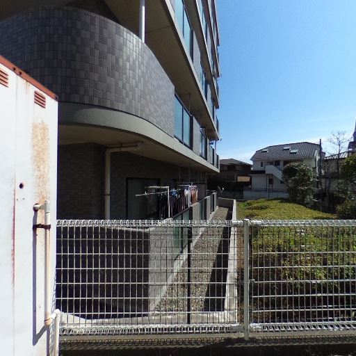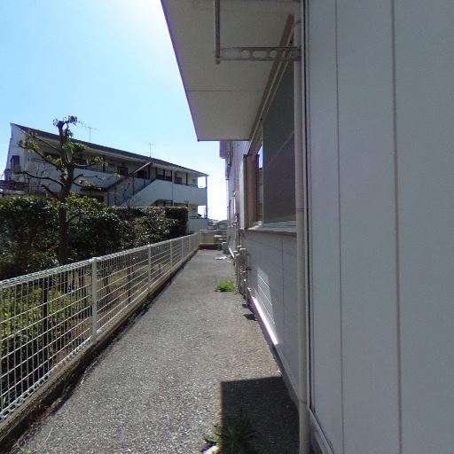 フェンスで外周が区切られている(確度84%):通路外周には金属フェンスがあり、敷地境界が明確になっている。完全な目隠しではないが、一定の区切りと転落防止にはなっている。