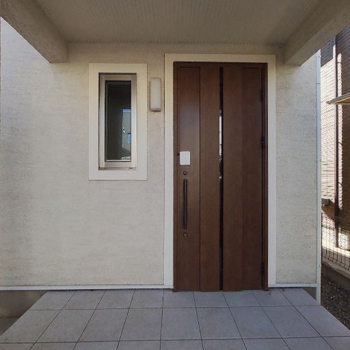 玄関ポーチのゆとり(確度82%):玄関前にタイル敷きのポーチがあり、奥行きもありそうで雨天時の出入りがしやすい。